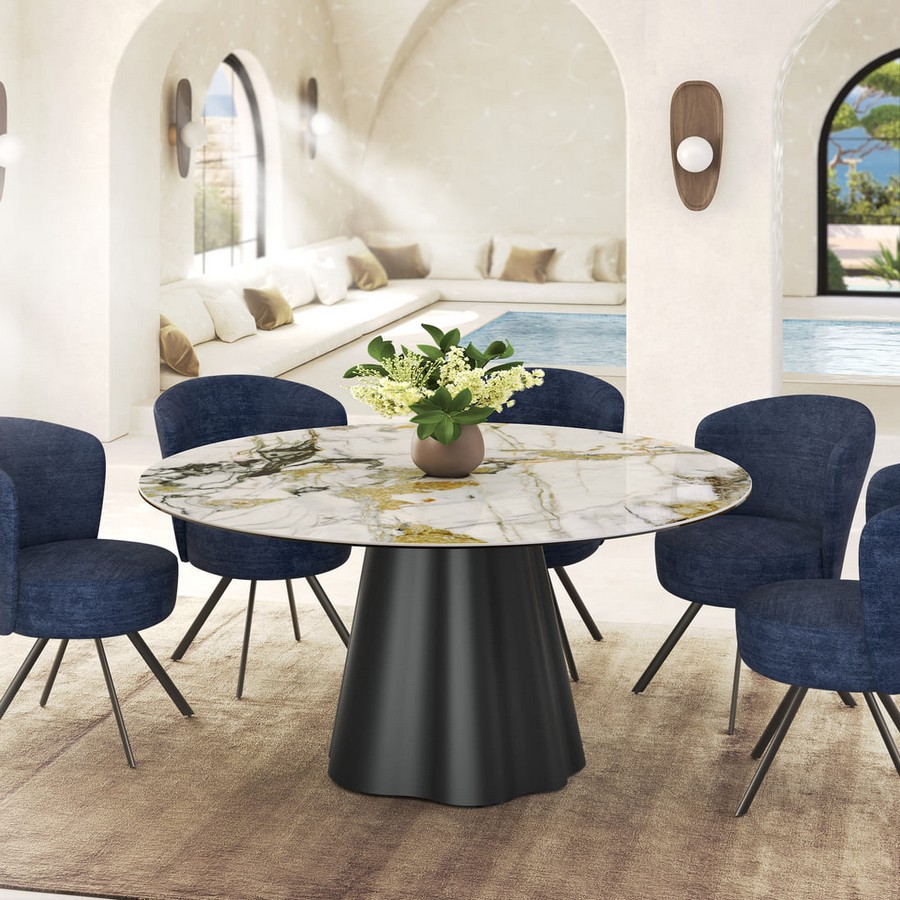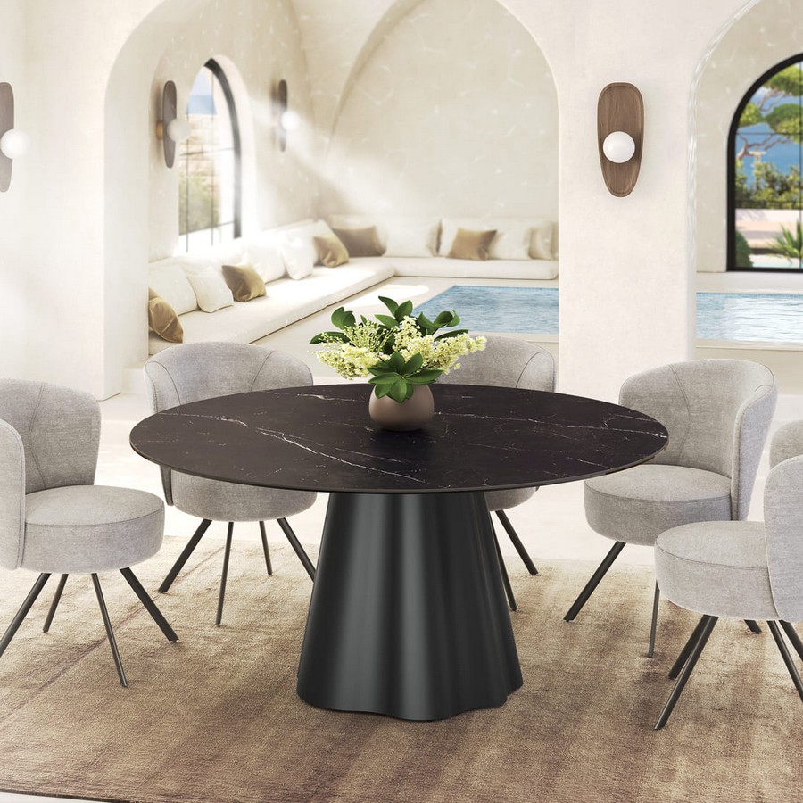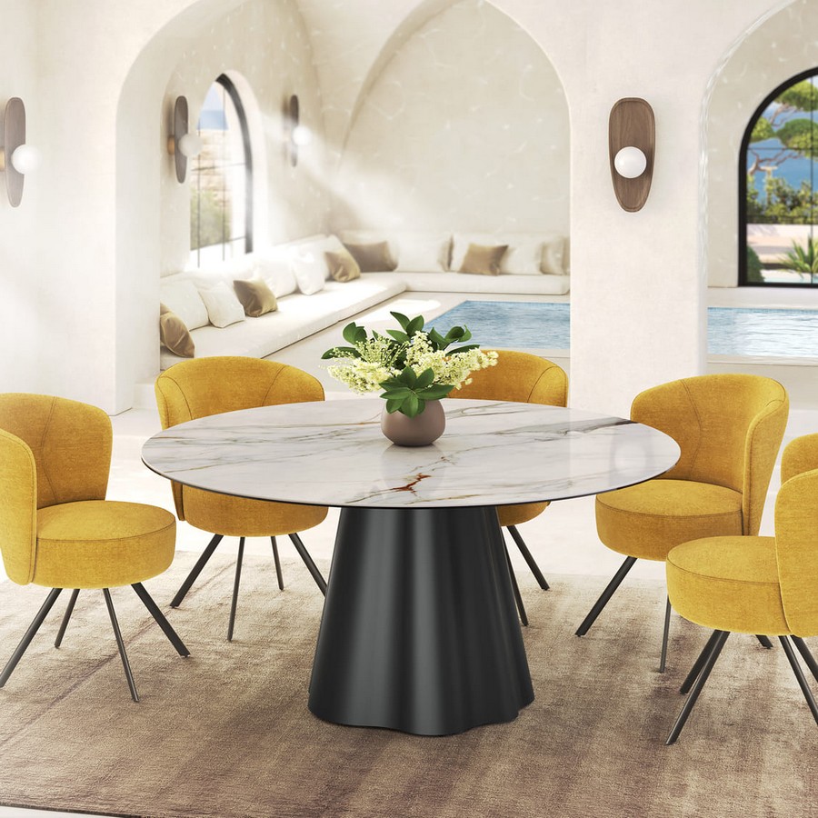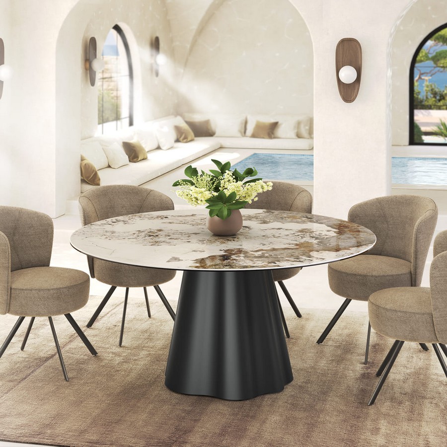 Kulatý jídelní stůl Piana kombinuje čistý design s odolnými materiály, které z něj vytvářejí stylový doplněk moderní jídelny. Keramická deska nabízí vysokou osolnost a snadnou údržbu, zatímco kovová podnož dodává stolu stabilitu a nadčasový charakter. Stůl je dostupný v několika rozměrech.
