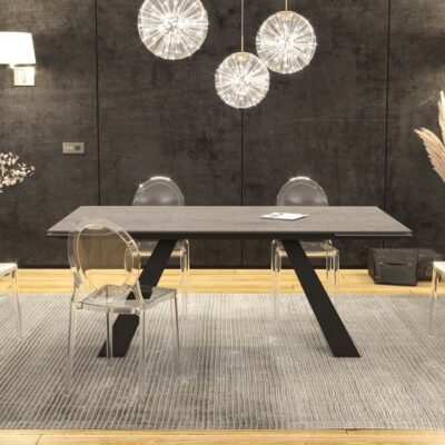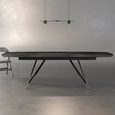 Jídelní stůl Sipario s výraznou kovovou podnoží a kvalitní stolovou deskou je dostupný v pevné i rozkládací verzi.