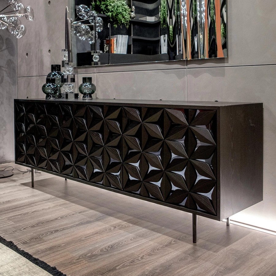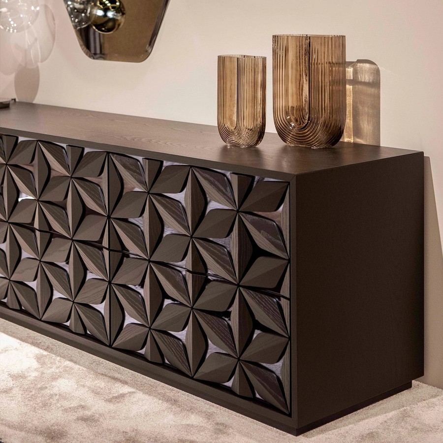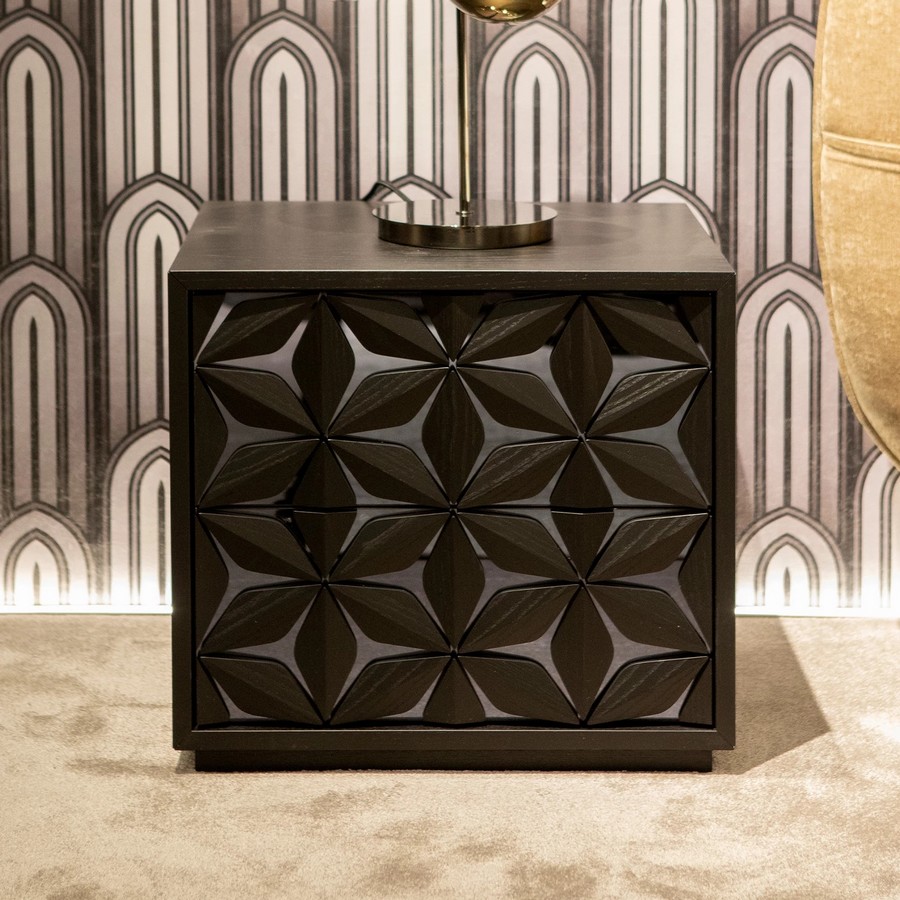 Designová kolekce komod All Star spojuje vzácné řemeslné zpracování a jedinečné propojení materiálů v jeden dokonalý celek. Nádherné detaily v podobě okvětních lístků z masivního dřeva pokrývají zrcadlová dvířka komody.