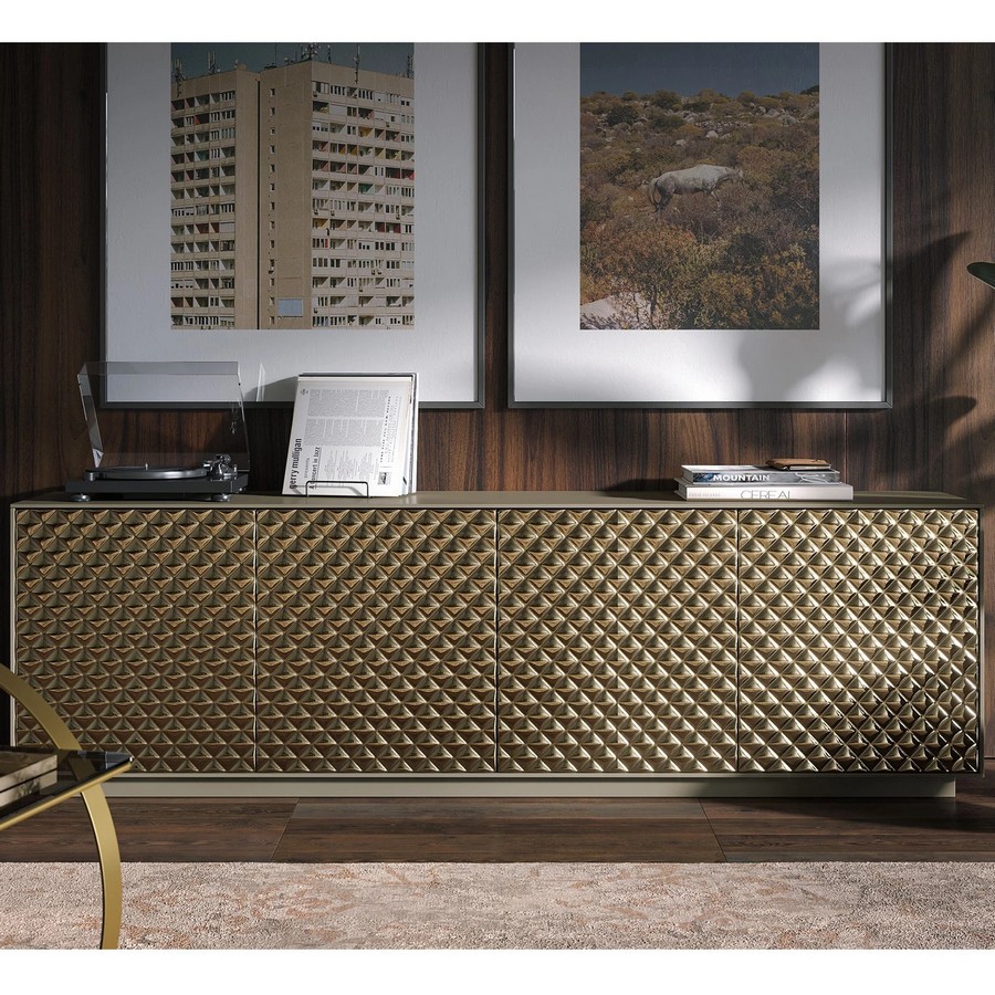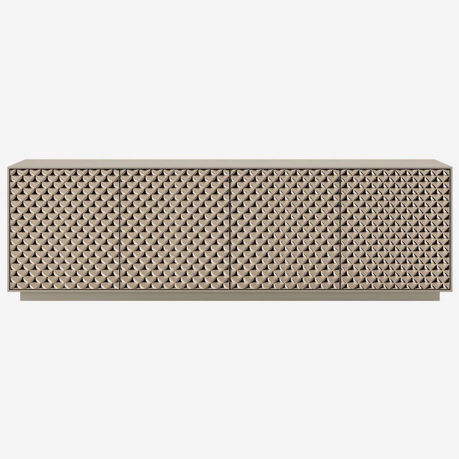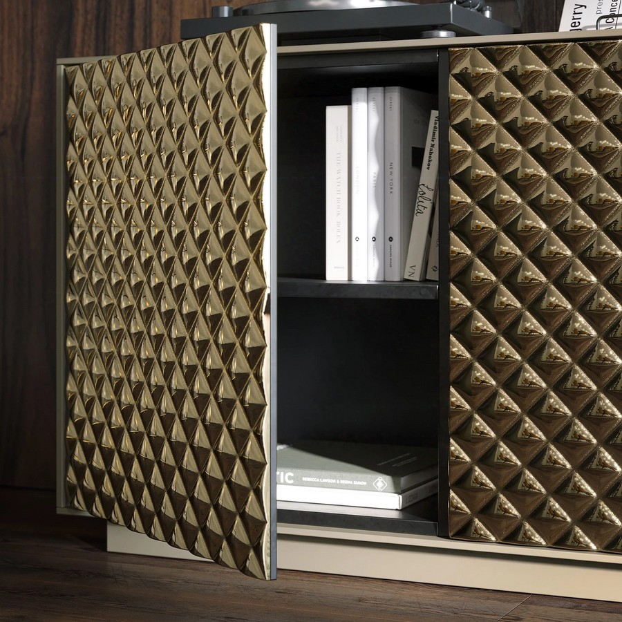 Komoda Luce zaujme elegantní lakovanou konstrukcí, kterou doplňují dveře ze zrcadlového skla s jemným geometrickým dekorem. Odrazy světla vytvářejí v interiéru útulnou atmosféru a dodávají prostoru na hloubce. Luce je ideální volba do moderně laděných interiérů nebo reprezentativních prostor.