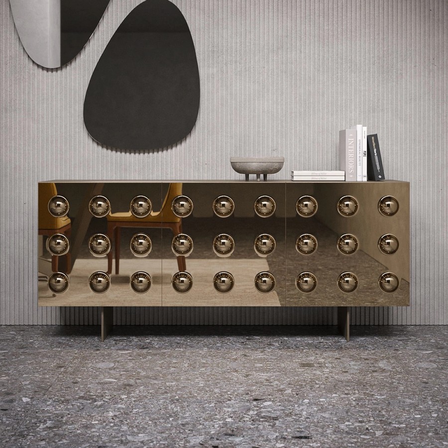 Designová komoda Rock vyniká výraznými dvířky. Každá dvířka komody jsou vyrobena ze zrcadlového skla s devíti 3D bublinami.