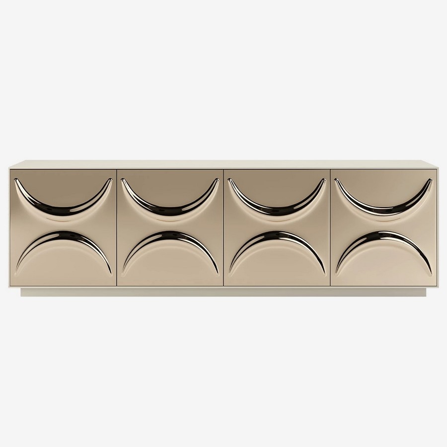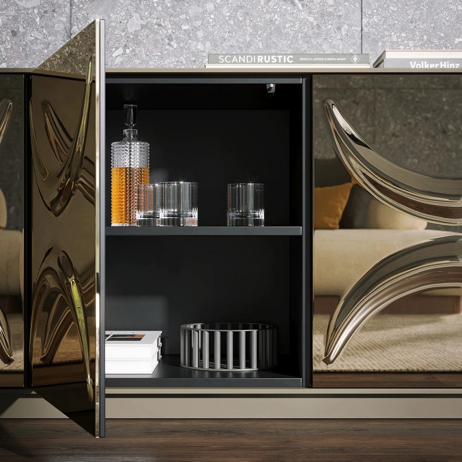 Originální komoda Selene přináší do interiéru eleganci a nádech luxusu. Výrazná zrcadlová dvířka se zajímavými geometrickými oblouky odkazují na prvky klasické architektury v moderním pojetí. Selene je ideální volbou do obývacích pokojů, jídelen či vstupních hal.