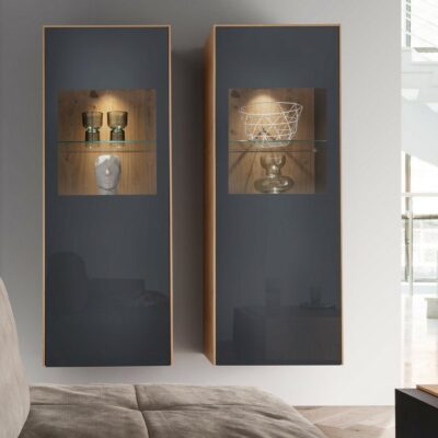 Nástěnná vitrína Modena je dostupná s elegantním proskleným středovým panelem nebo s plnými dvířky.