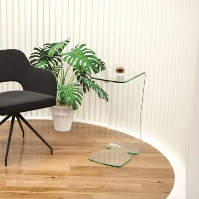 Minimalistický odkládací stůl Beside je tvořen pouze z jednoho kusu zaobleného skla.
