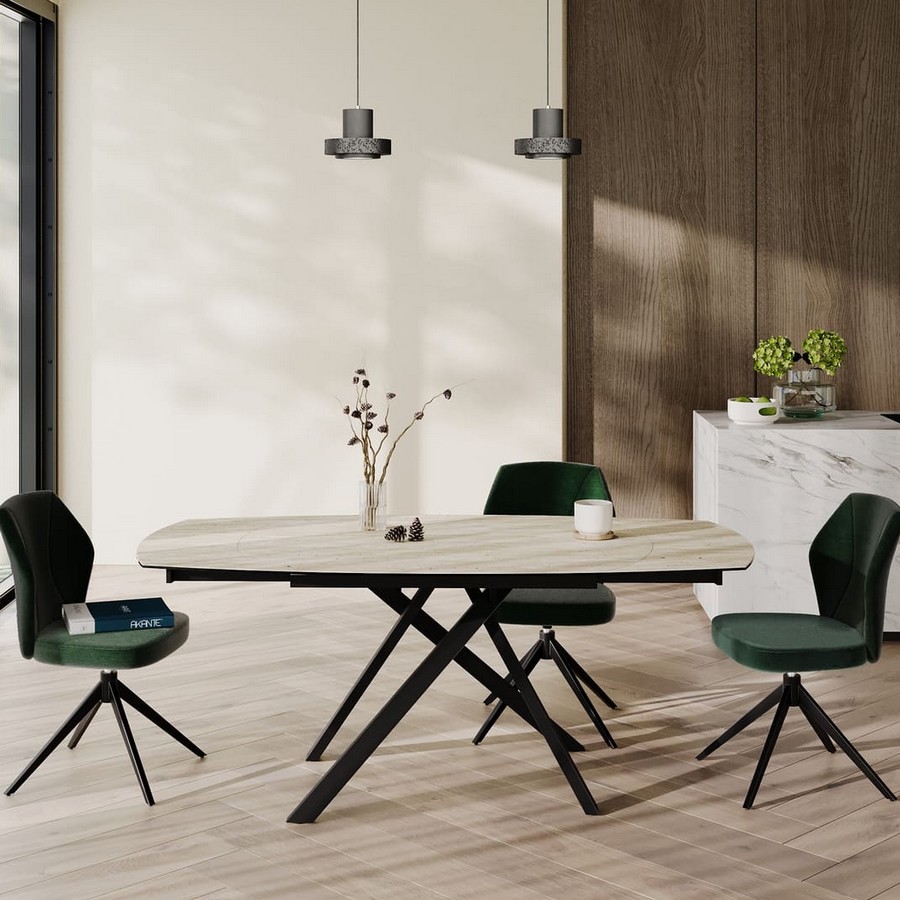 Rozkládací jídelní stůl Stromboli je výrazným designovým prvkem moderní jídelny. Zaujme originálním provedením a elegantní keramickou deskou v několika odstínech. Možnost rozložení nabízí komfort pro každodenní stolování i větší setkání.