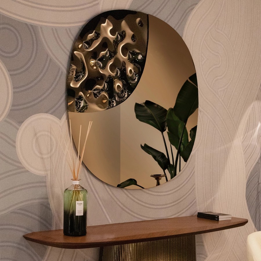 Designové zrcadlo Diamante se díky speciálnímu zpracování leskne z každého úhlu jinak. Kombinace hladkého povrchu a diamantového efektu vytváří originální doplněk každé stěny ve Vašem interiéru.